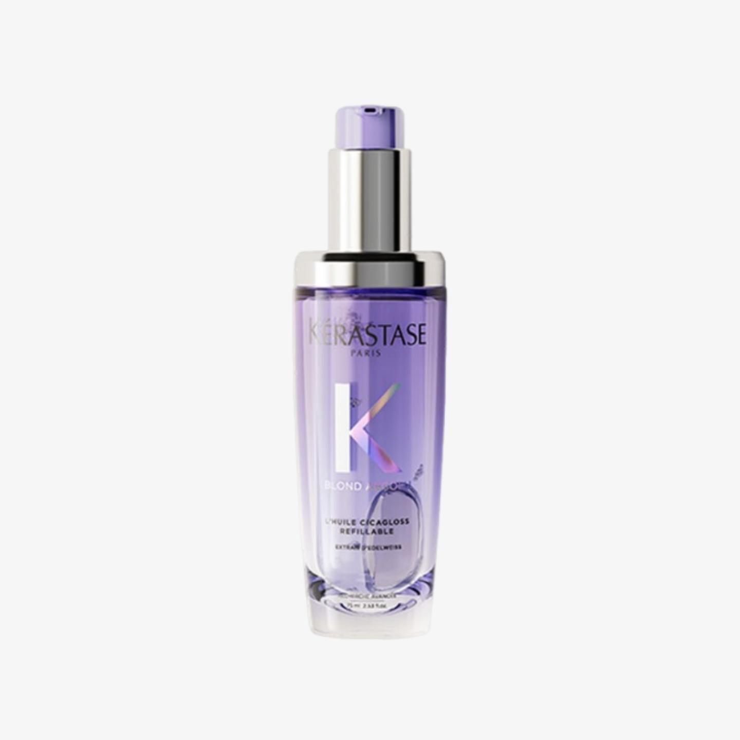 The refillable Kérastase Blond Absolu Cicagloss oil formula, enriched with Edelweiss, provides deep hydration, strengthens compromised fibre and helps