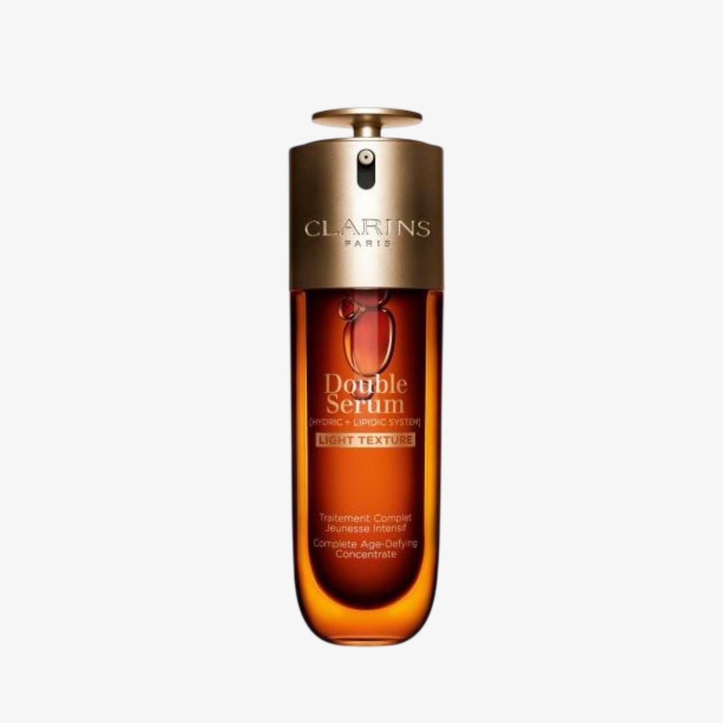 Clarins Double Serum Light Texture's key active ingredients include Organic Harungana, Teasel (Dipsacus Sylvestris), Horse Chestnut (Escin), Ginger Lily (Hedychium Coronarium), Organic Leaf of Life, Plant-based Squalane, Acetyl Hyaluronic Acid, and Turmeric, which work together with 22 plant extracts and 5 active molecules to stimulate the skin's five vital functions: hydration, nutrition, oxygenation, regeneration, and protection.