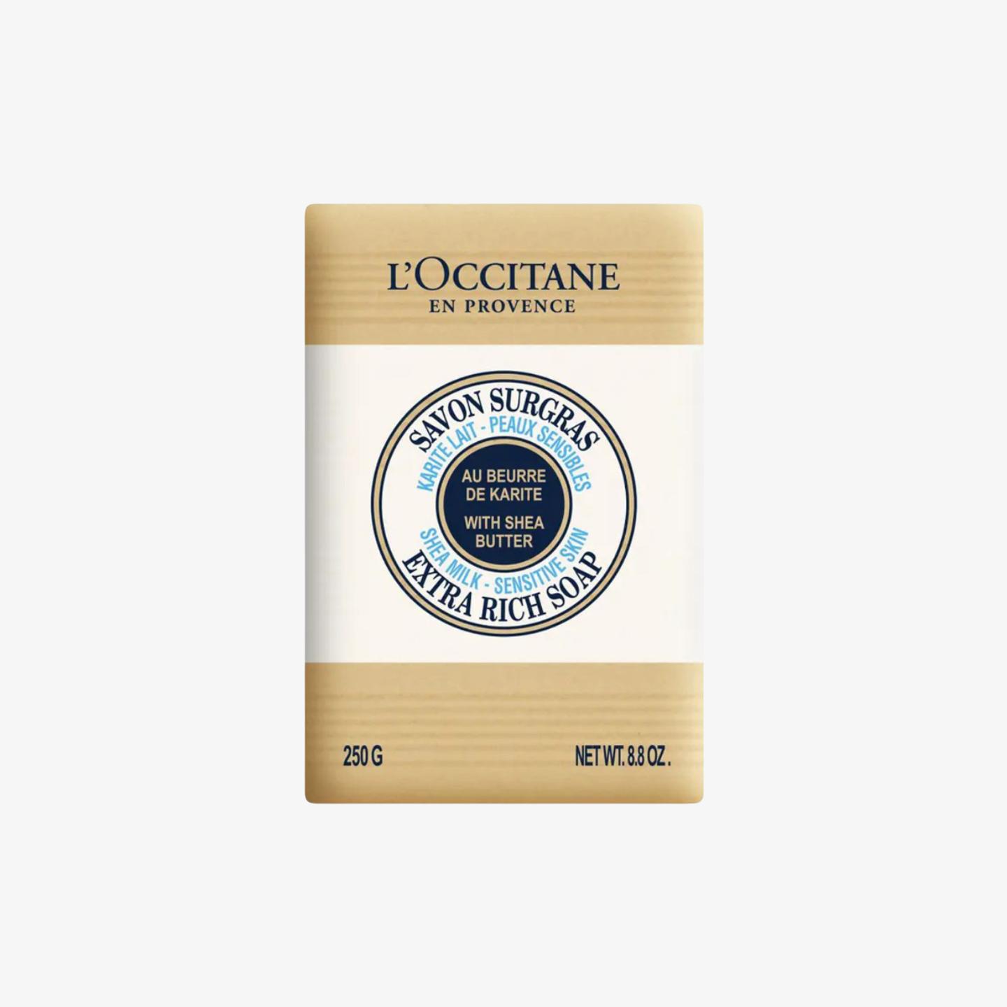 L'Occitane's Shea Butter Extra Rich Soap with Shea Milk is a nourishing bar designed for sensitive skin. Enriched with Organic Shea Butter and Shea Milk, it provides deep hydration and prevents dryness.