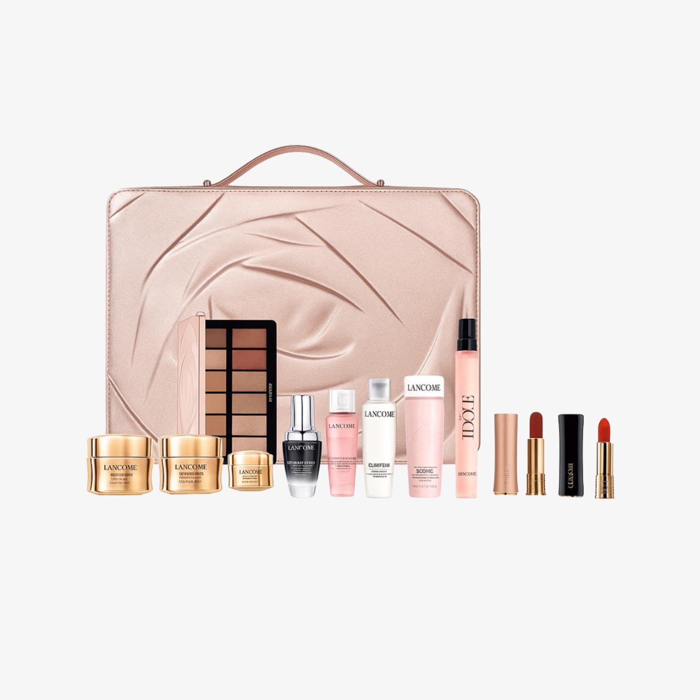 12件Lancôme明星產品組合,涵蓋抗老精華、唇膏、香水、眼霜、卸妝與彩妝,滿足全套節慶妝容需求